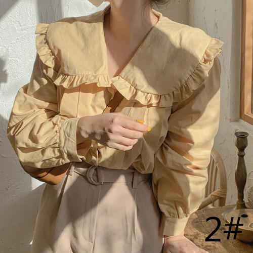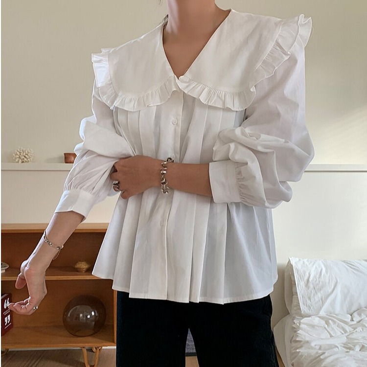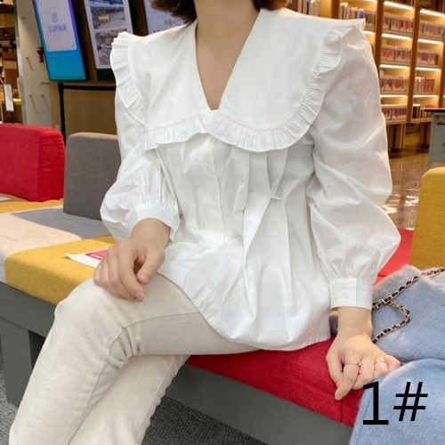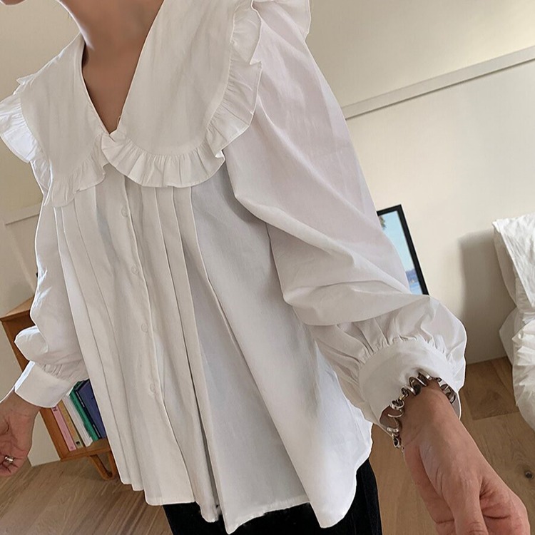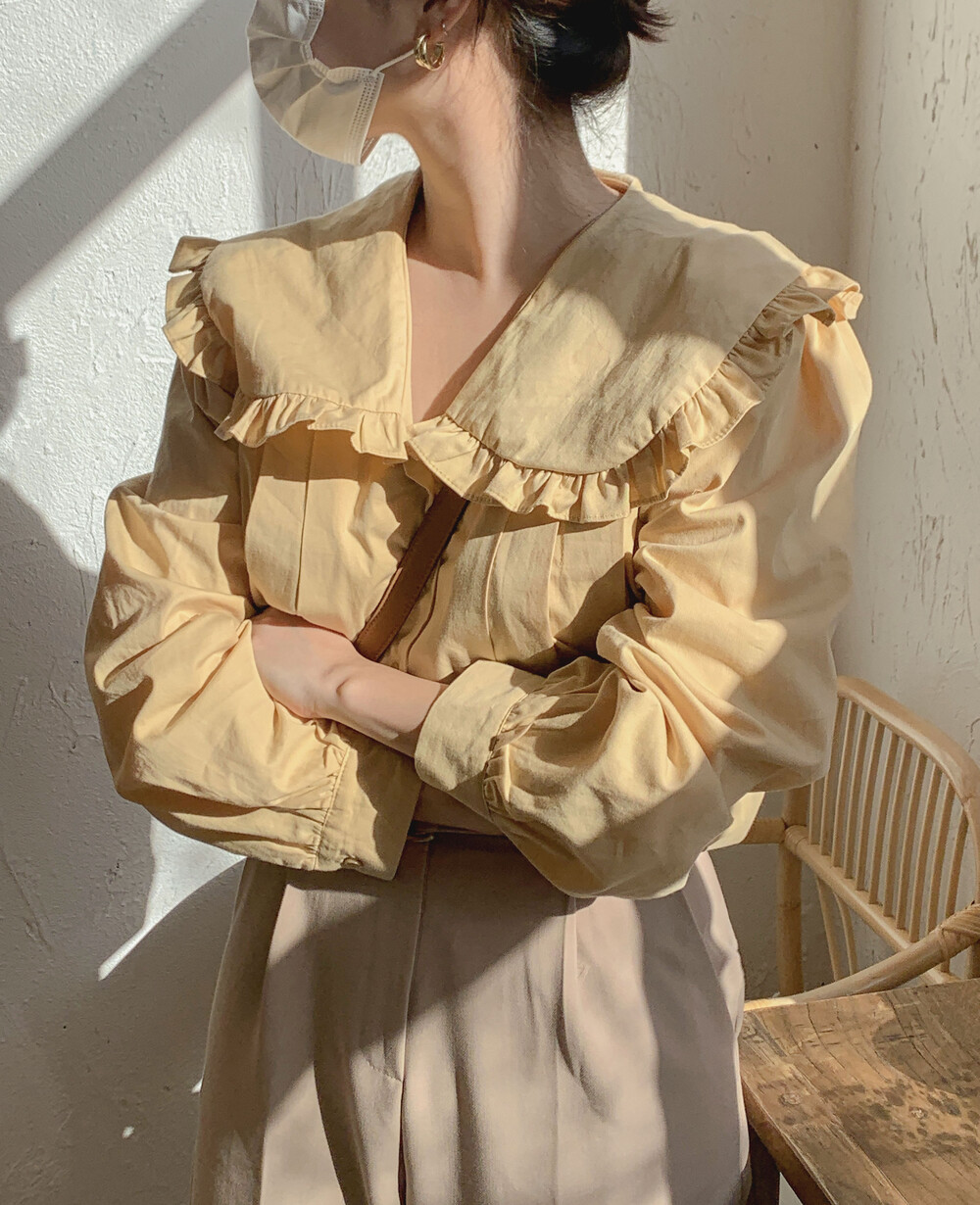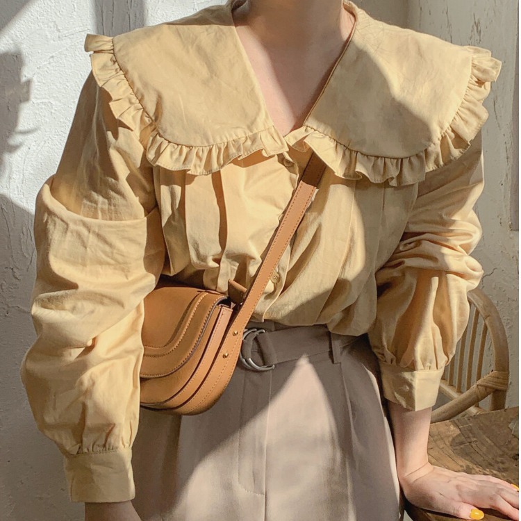 上品なフリル襟が女性らしさを演出し、ふんわりとしたパフスリーブが大人可愛い印象に。