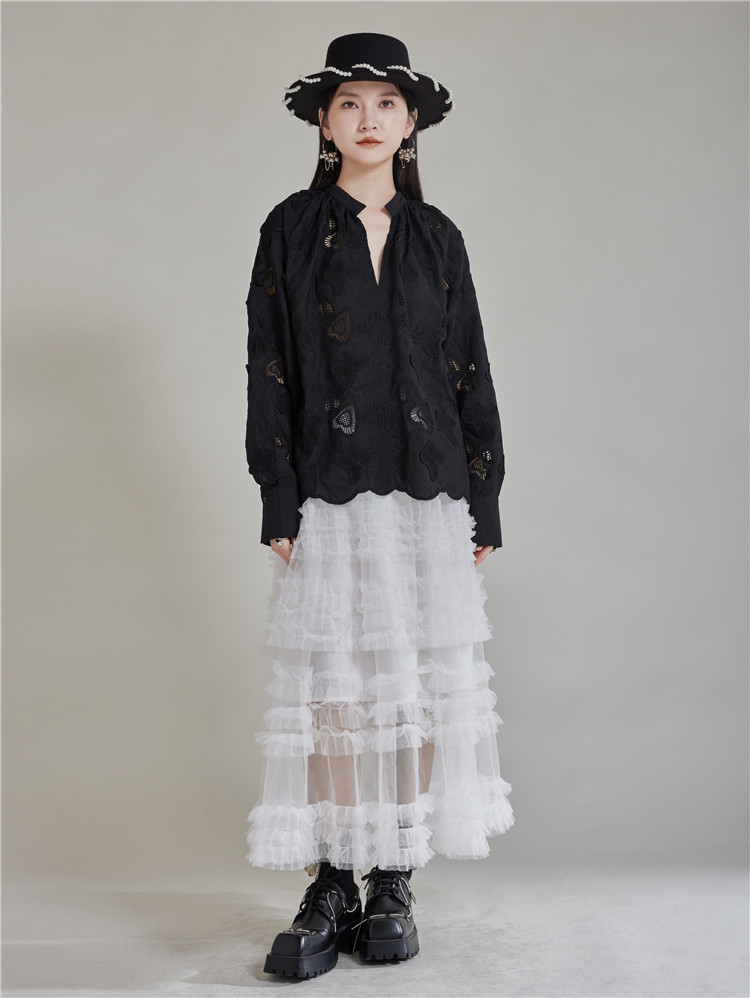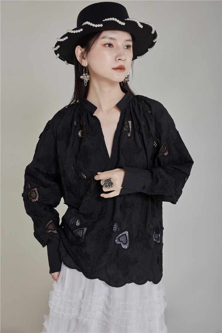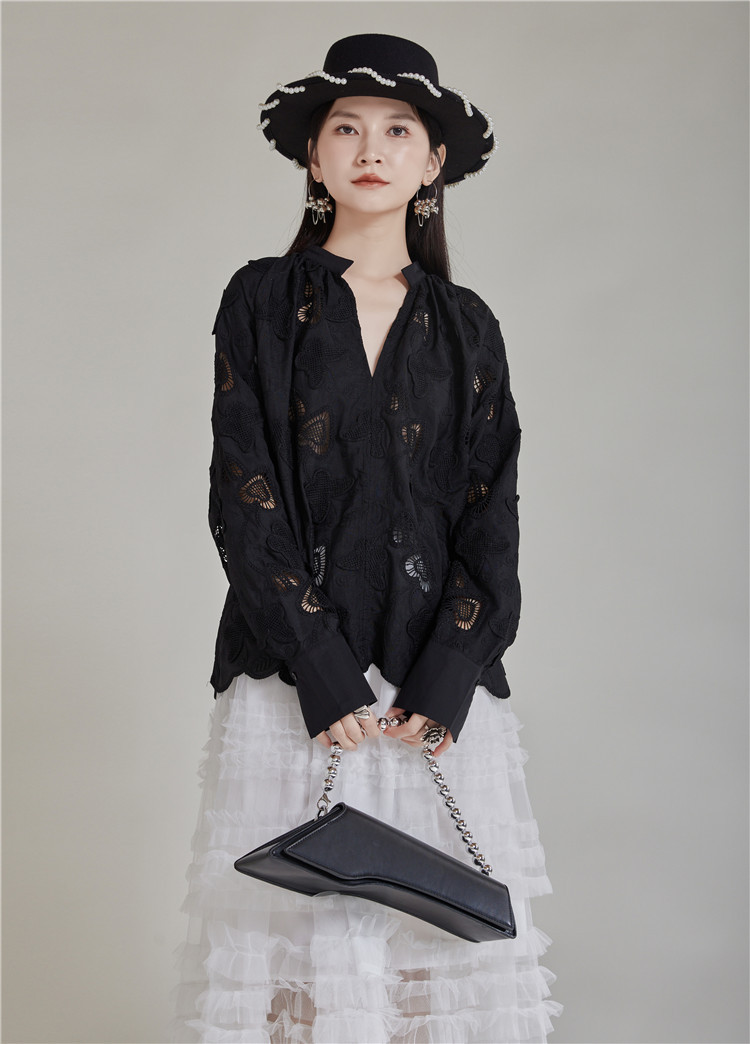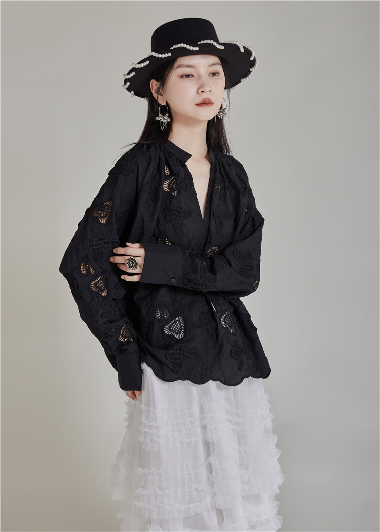 エレガントな蝶の刺繍とカットワークが美しいブラウスです。 黒地に繊細な透かし模様が上品な印象を演出します。 袖口と裾のスカラップデザインがフェミニンな魅力をプラス。 きれいめからカジュアルまで幅広いスタイリングに対応する万能アイテムです。