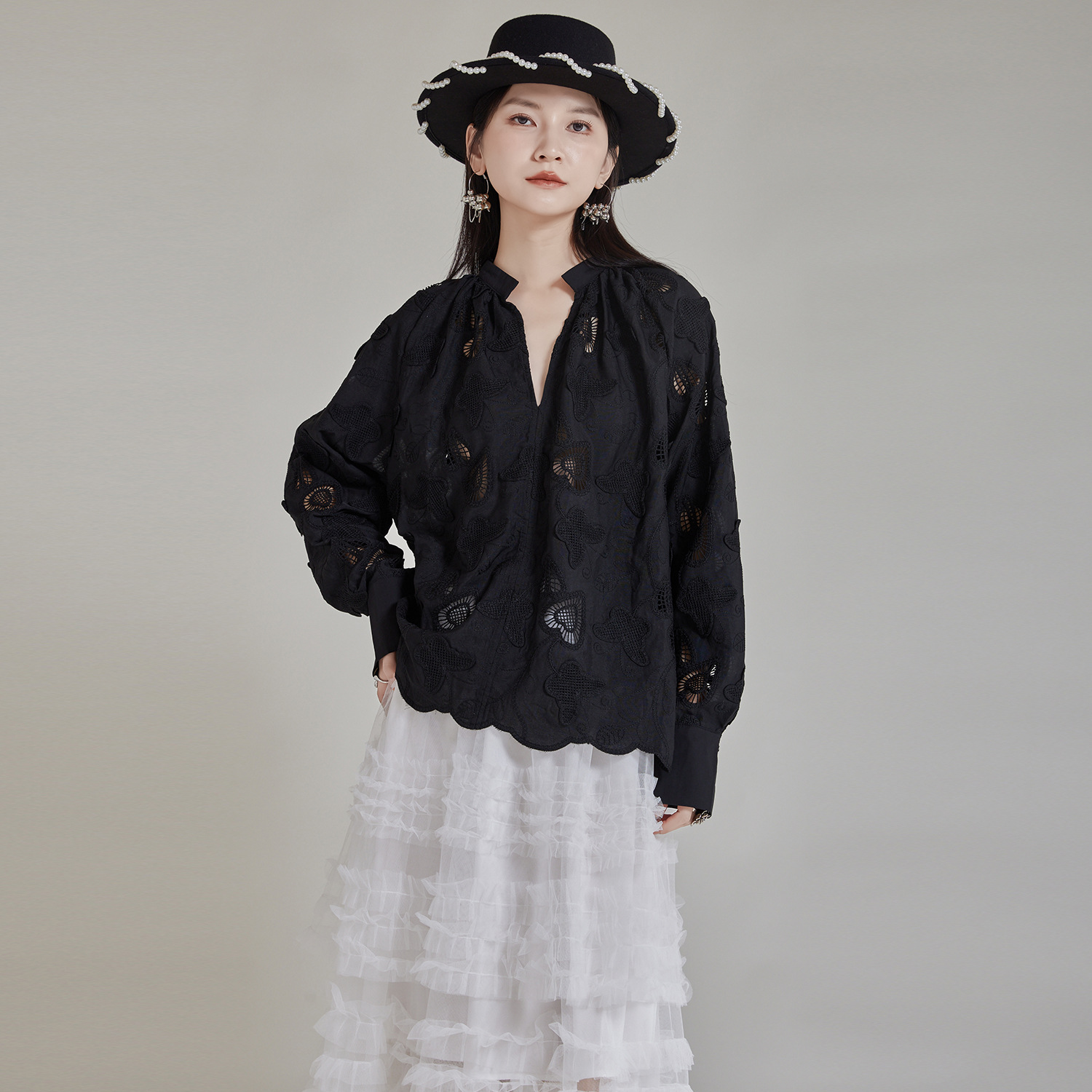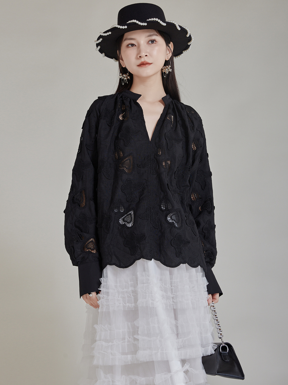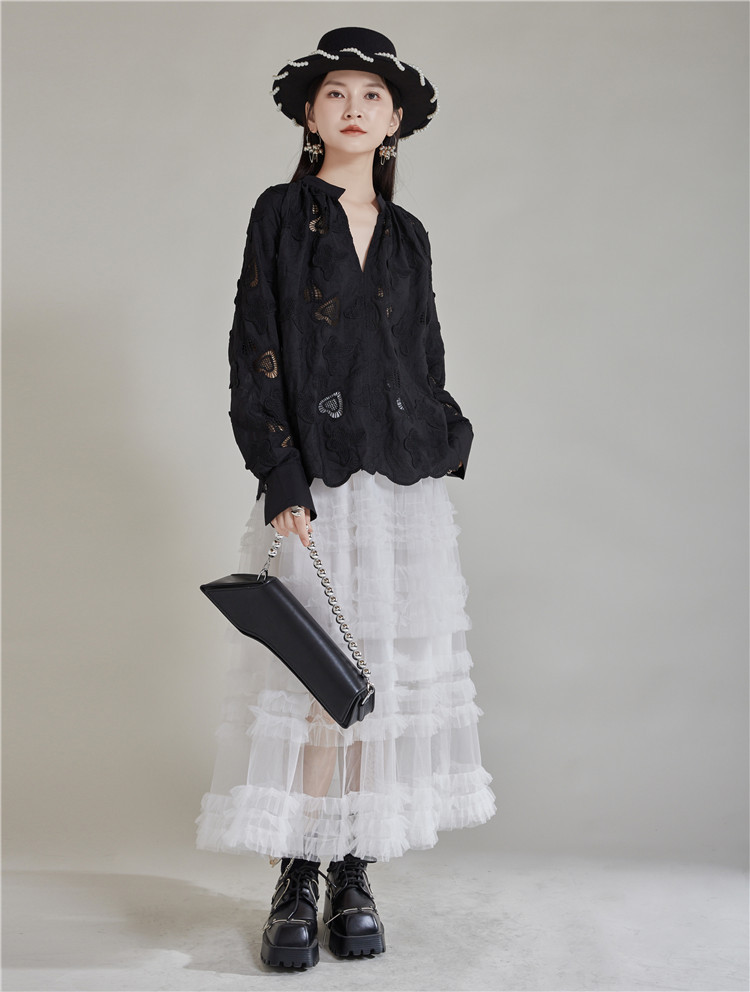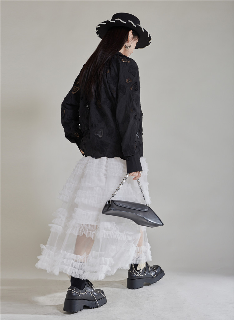 エレガントな蝶の刺繍とカットワークが美しいブラウスです。 黒地に繊細な透かし模様が上品な印象を演出します。 袖口と裾のスカラップデザインがフェミニンな魅力をプラス。 きれいめからカジュアルまで幅広いスタイリングに対応する万能アイテムです。
