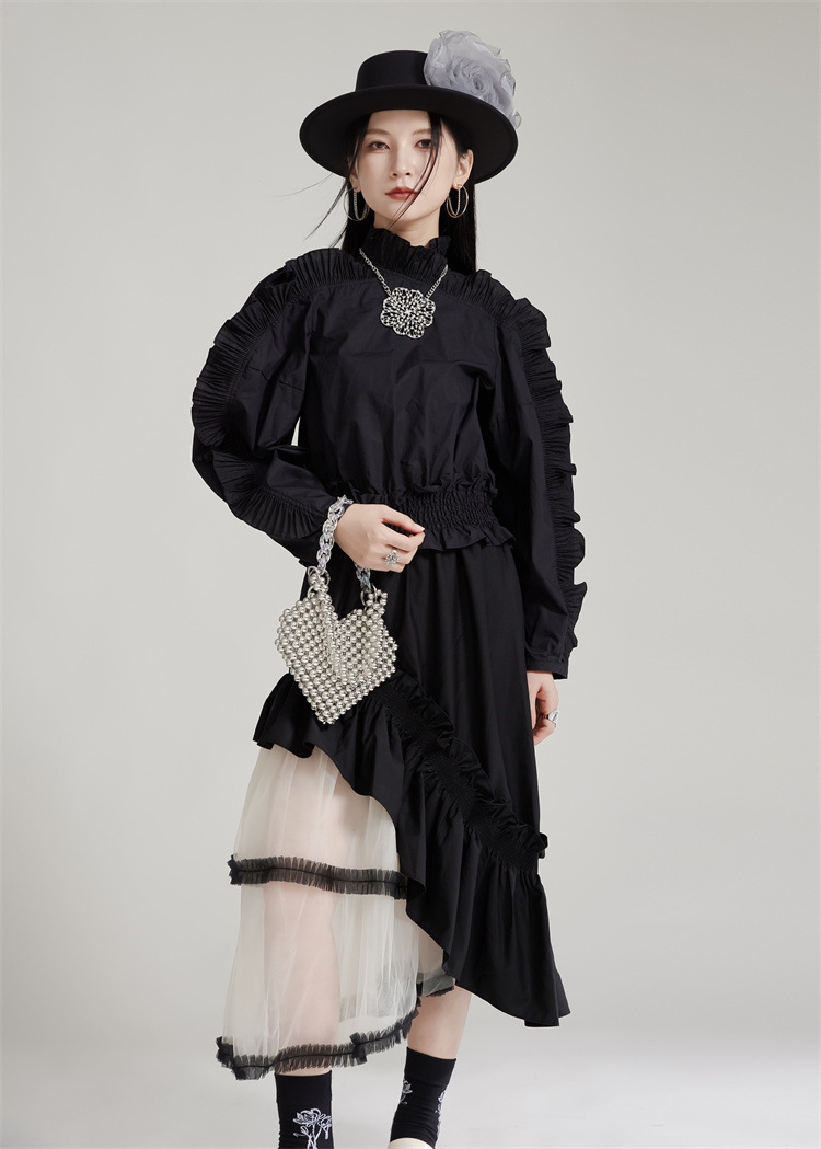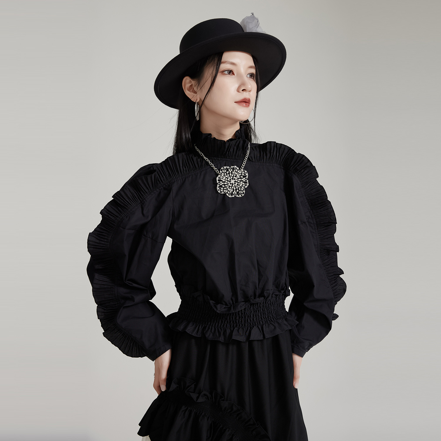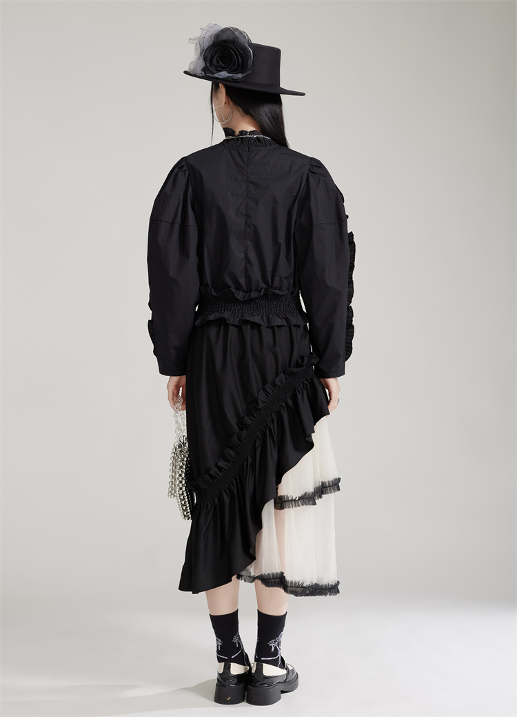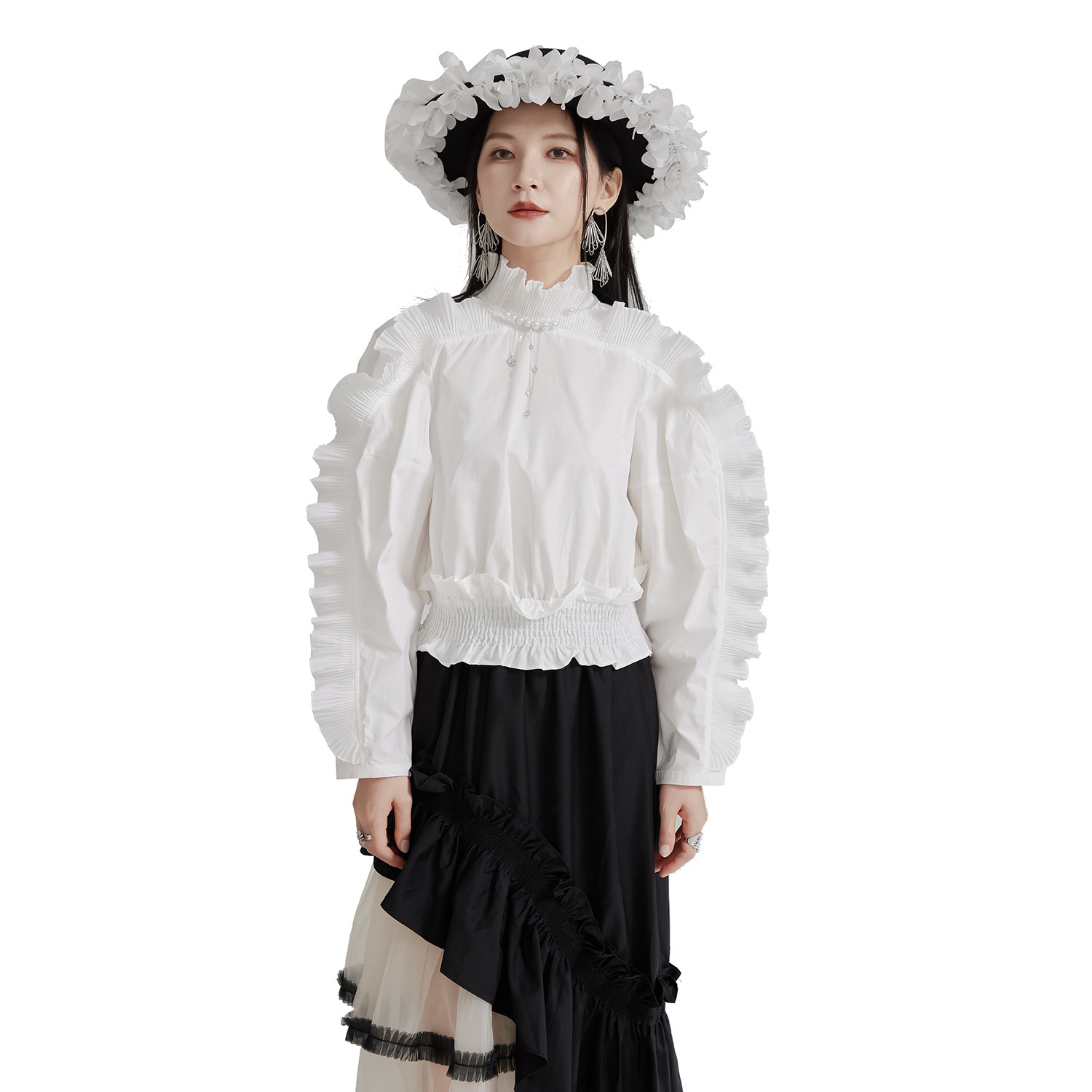 エレガントな宮廷風デザインが魅力的なフリルブラウスです。 袖全体に施された美しいプリーツフリルが上品さを演出し、 春秋シーズンにぴったりの素材感で着心地も抜群です。 お出かけや特別な日のコーディネートにおすすめのブラウスです。