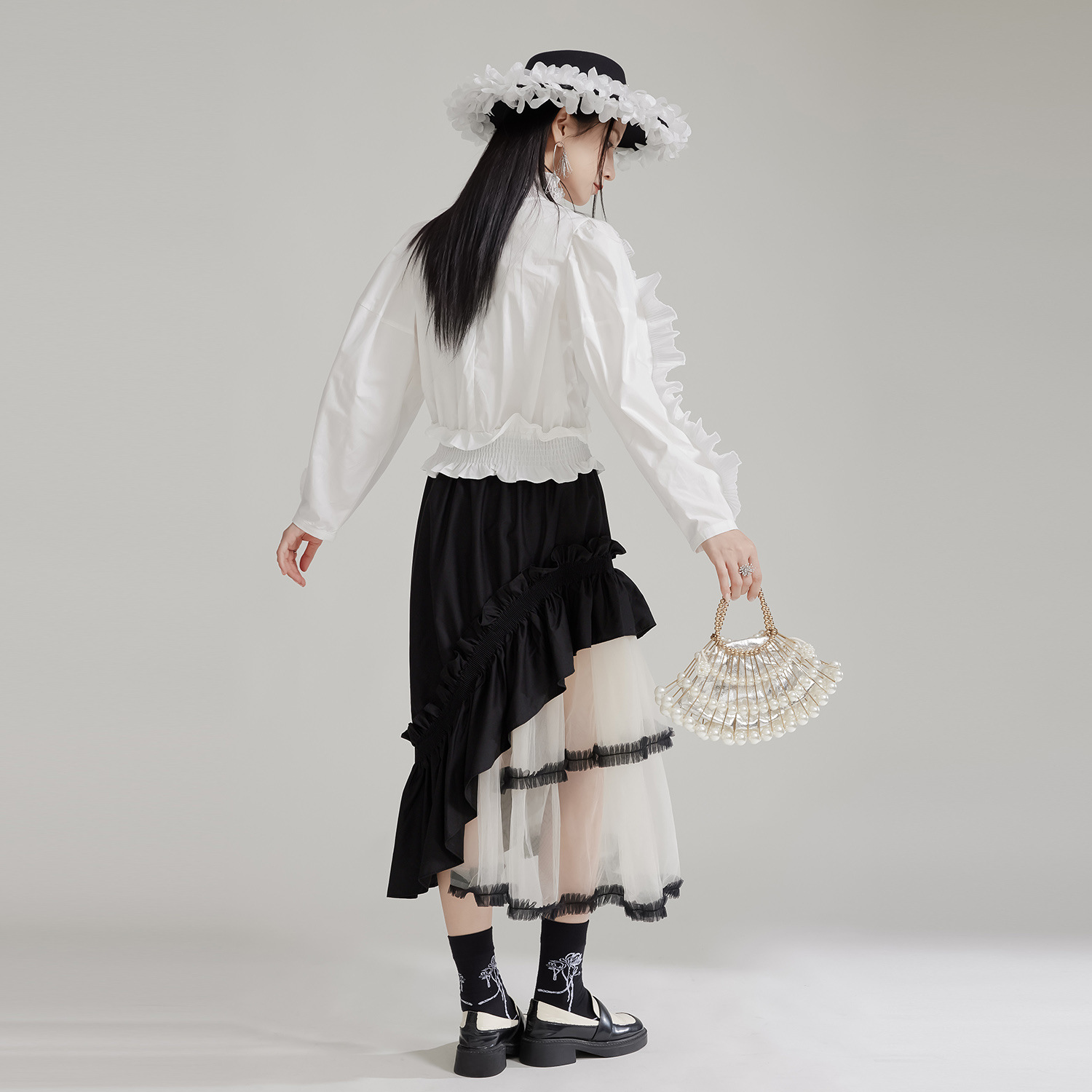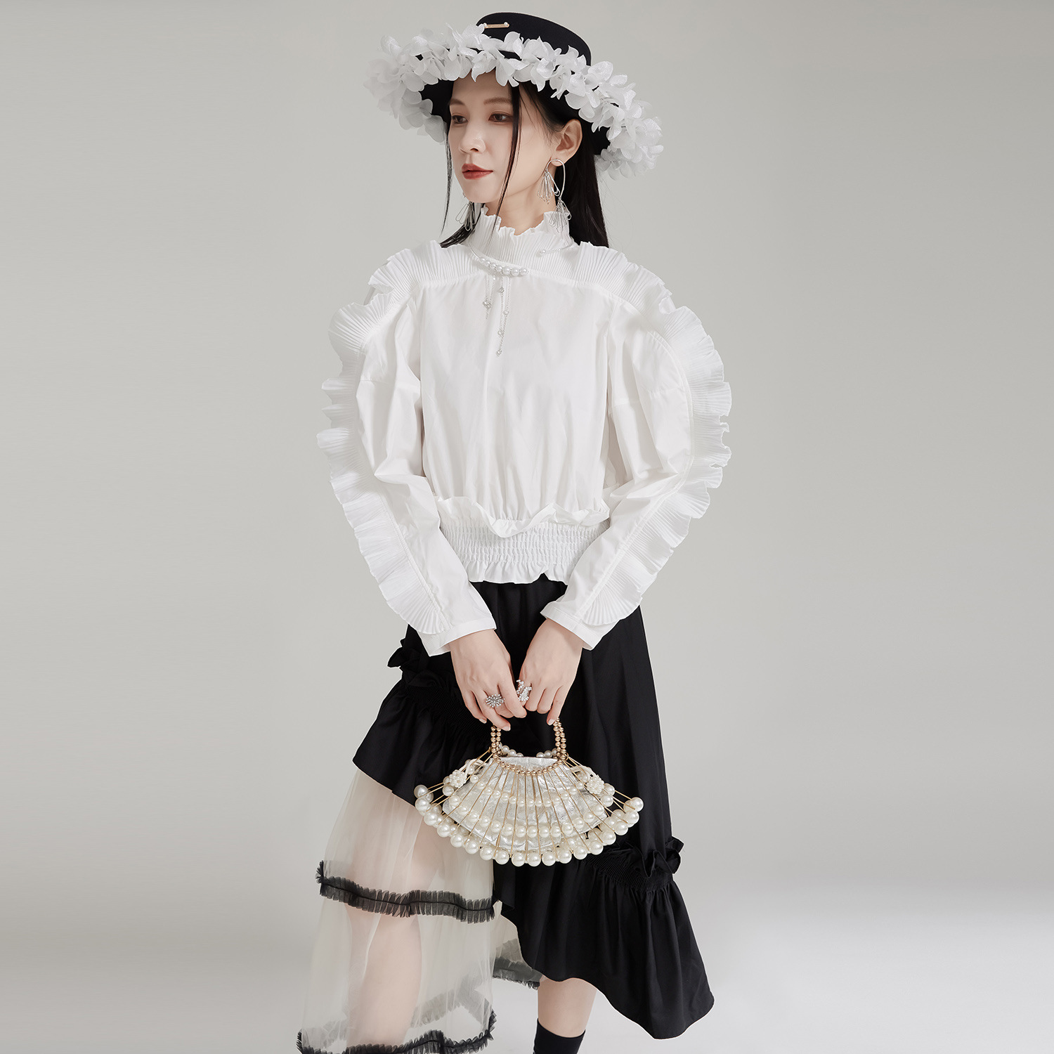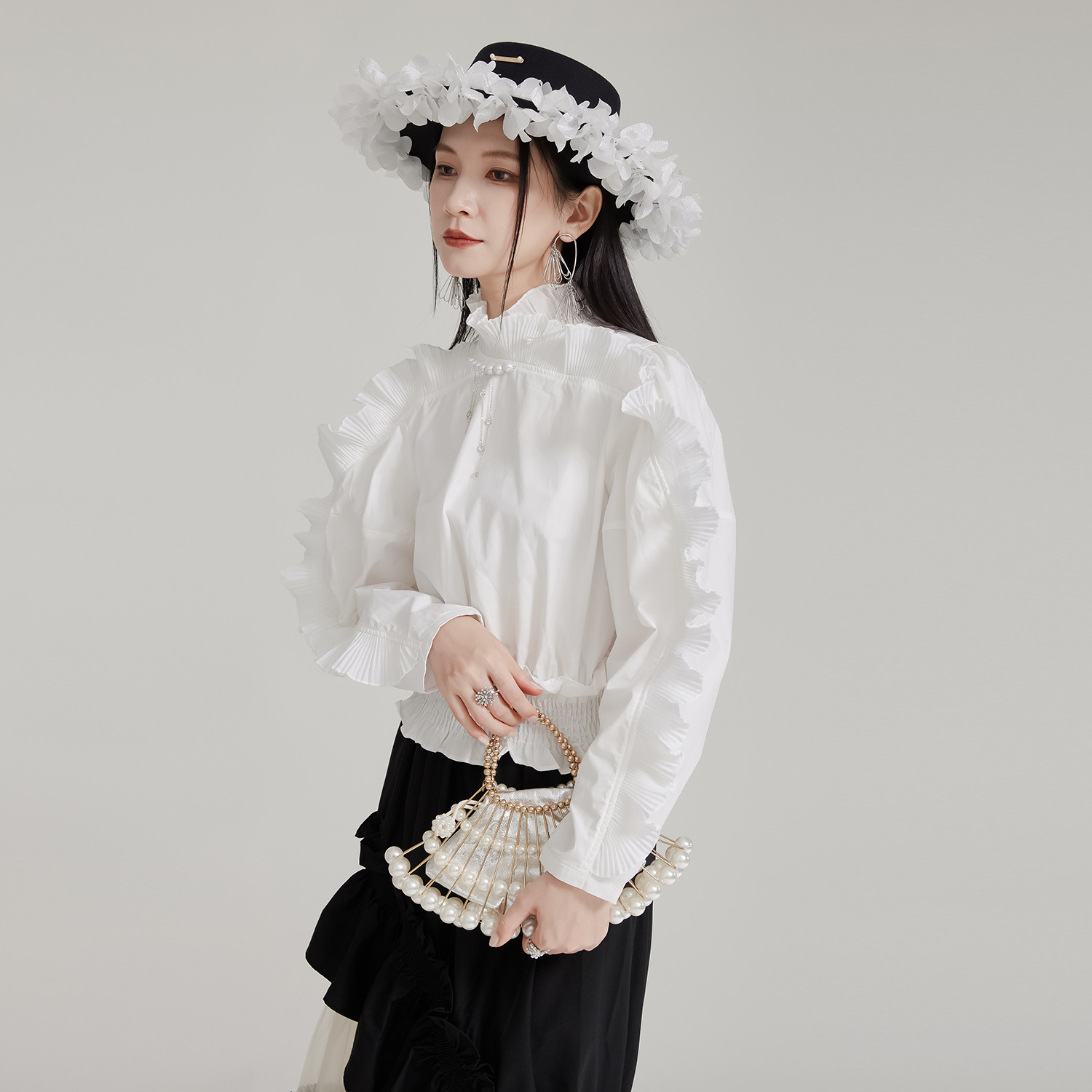エレガントな宮廷風デザインが魅力的なフリルブラウスです。 袖全体に施された美しいプリーツフリルが上品さを演出し、 春秋シーズンにぴったりの素材感で着心地も抜群です。 お出かけや特別な日のコーディネートにおすすめのブラウスです。