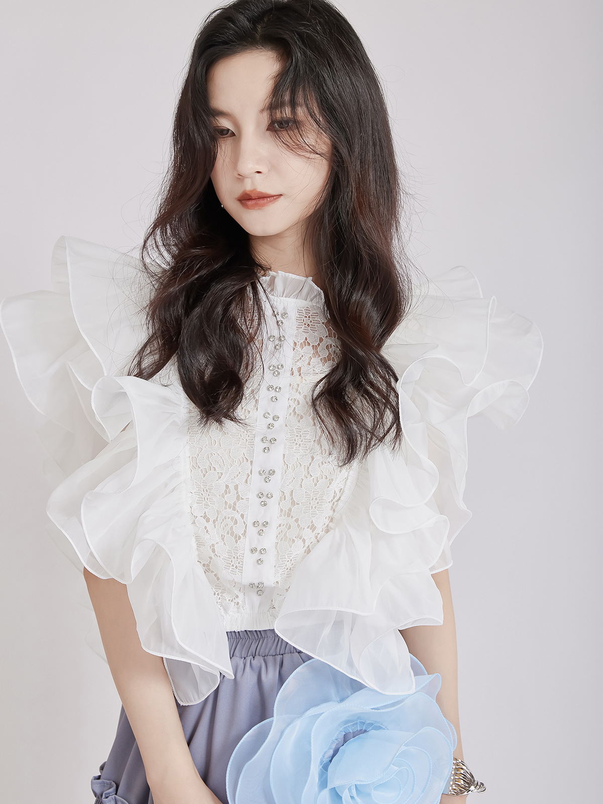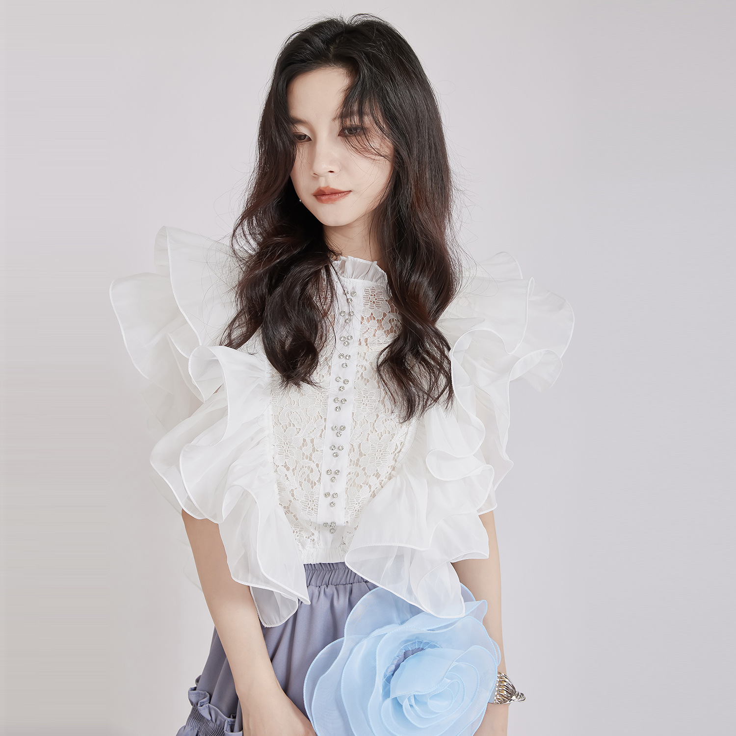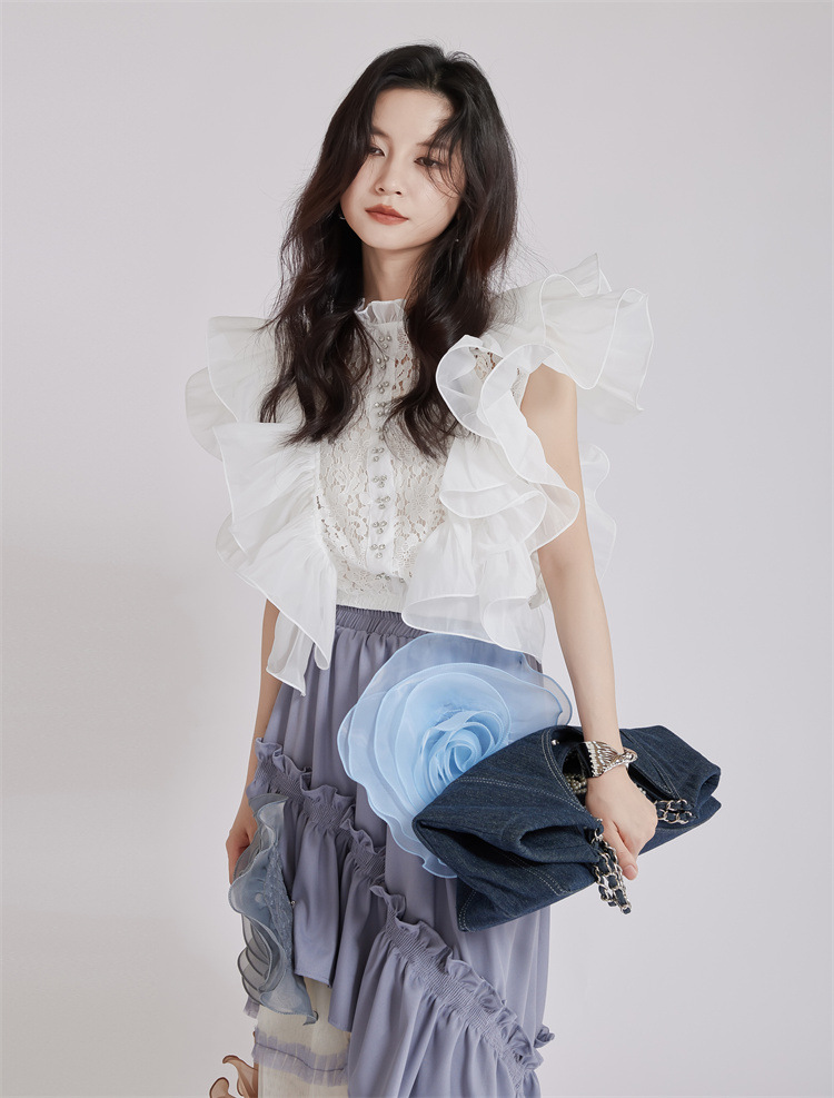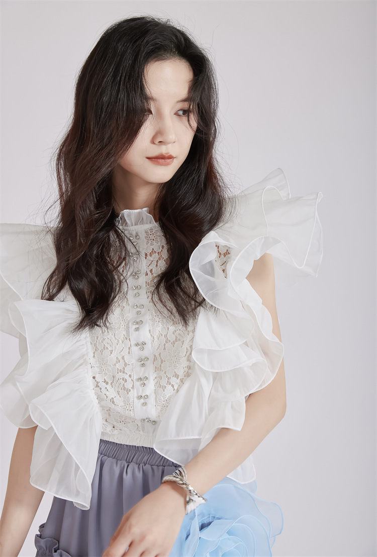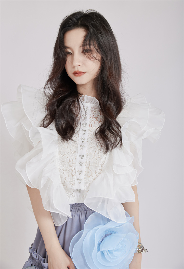 繊細なレース切替とボリュームたっぷりのパフスリーブが魅力的なブラウスです。 フリルデザインが女性らしさを演出し、どんなボトムスとも相性抜群。 上品な白色で清楚な印象を与える、大人可愛いスタイルが完成します。