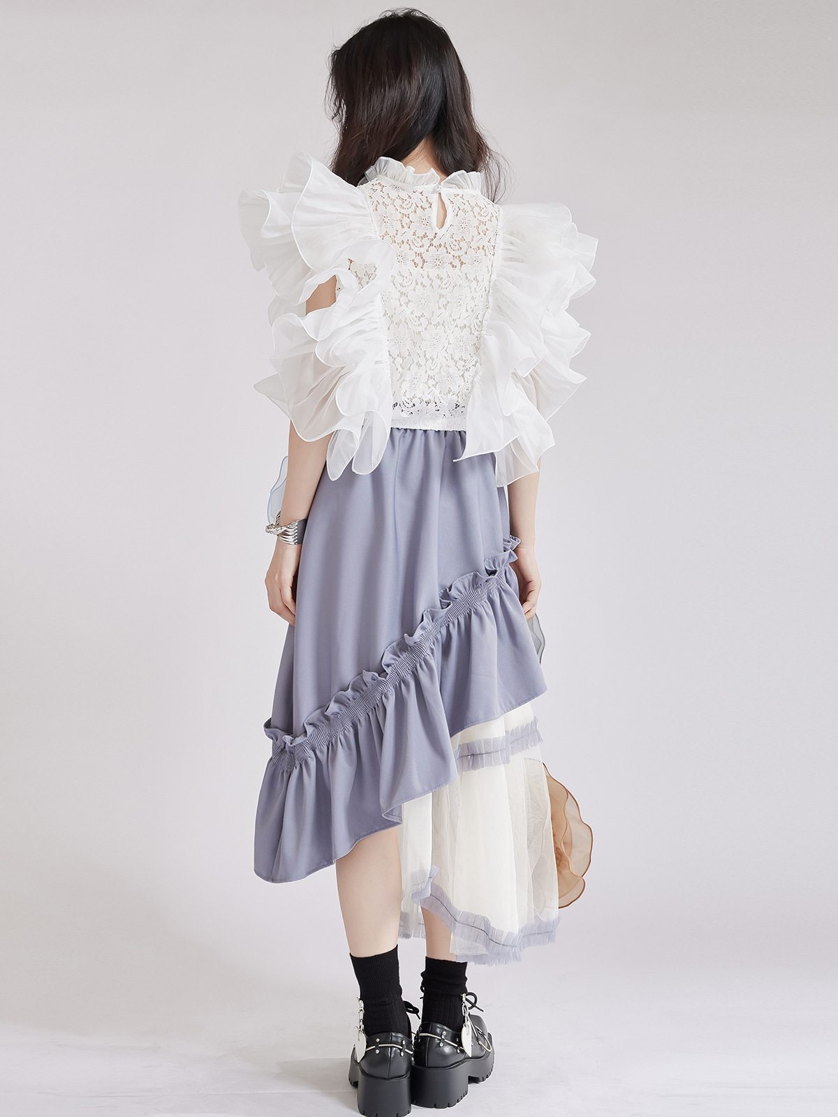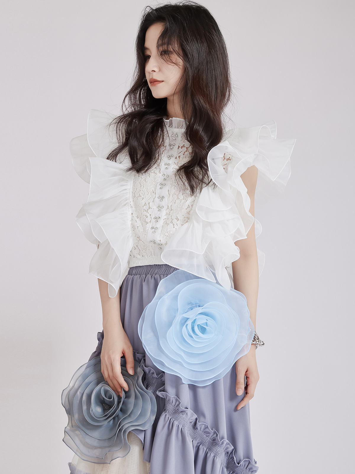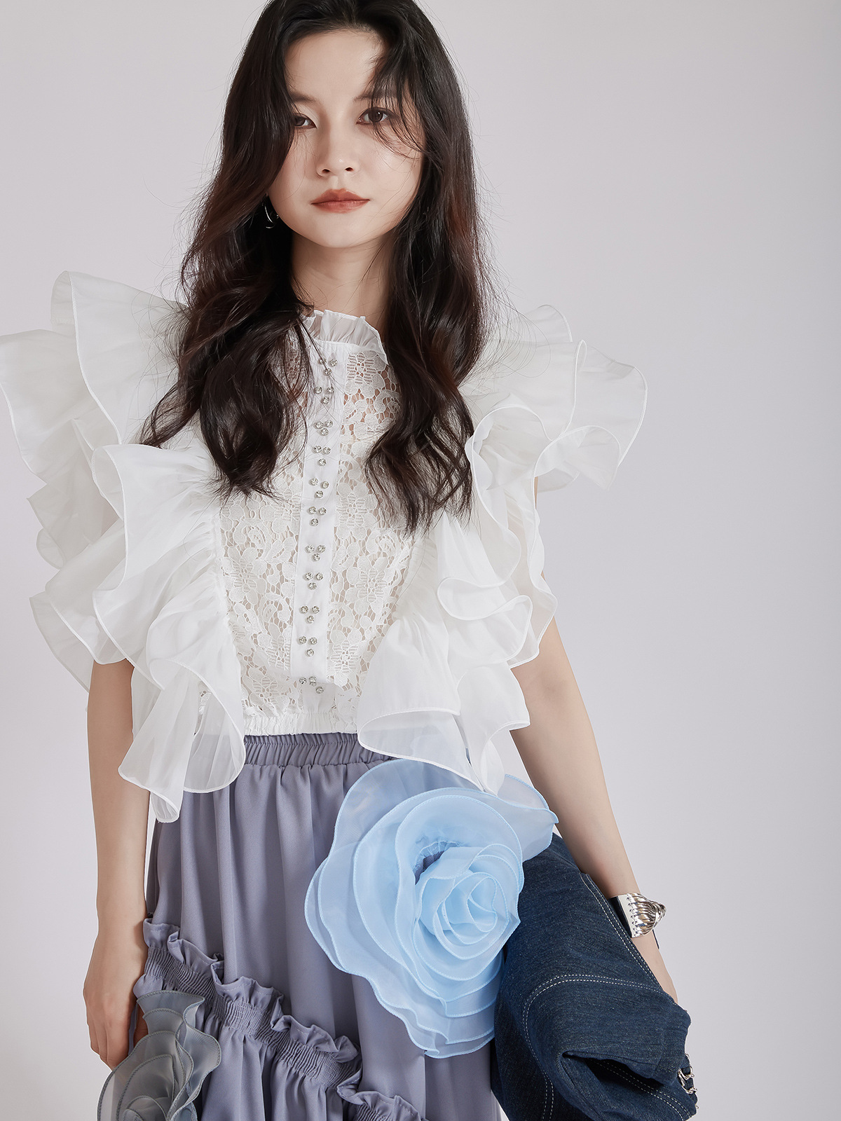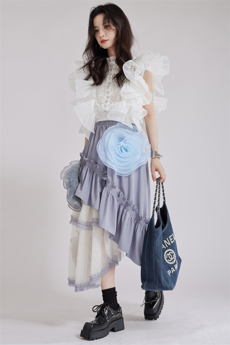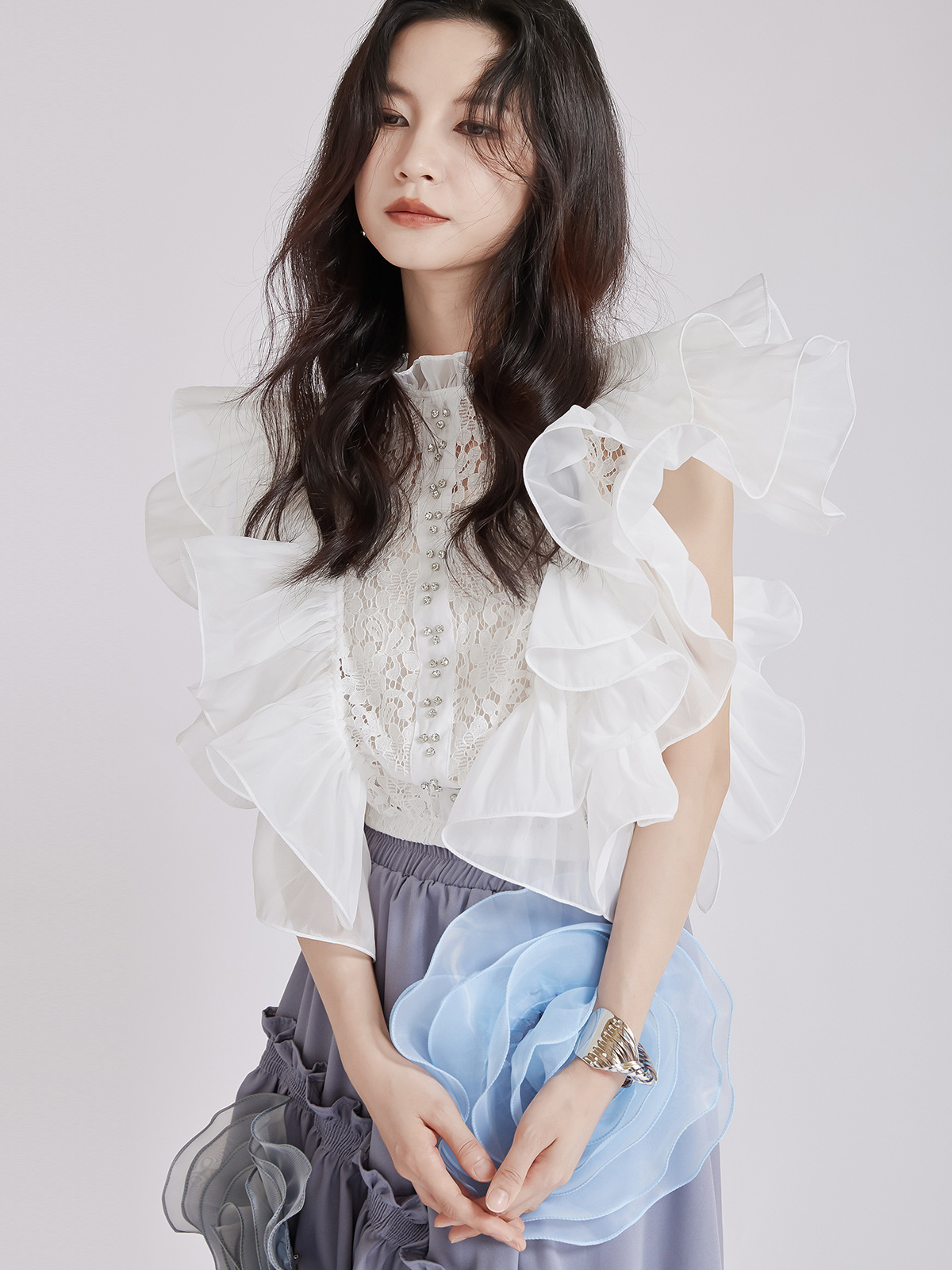 繊細なレース切替とボリュームたっぷりのパフスリーブが魅力的なブラウスです。 フリルデザインが女性らしさを演出し、どんなボトムスとも相性抜群。 上品な白色で清楚な印象を与える、大人可愛いスタイルが完成します。