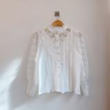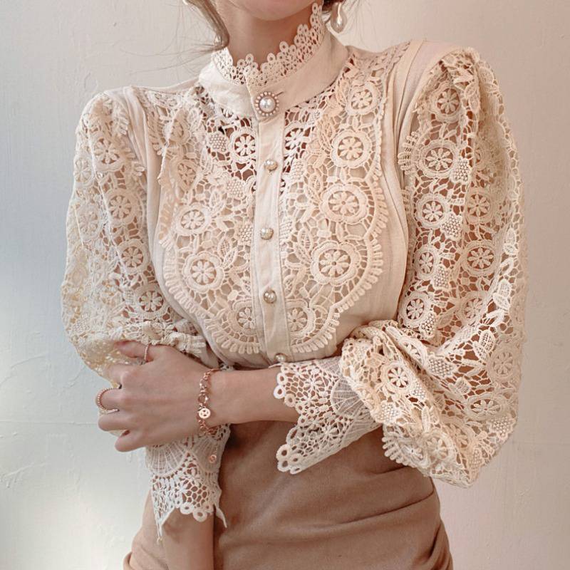 繊細なレース刺繍が美しい上品なブラウスです。 袖にボリュームがあり、フェミニンな印象を演出します。 通勤や特別な日にもぴったりの洗練されたデザインで、 一枚で華やかなスタイリングが完成します。