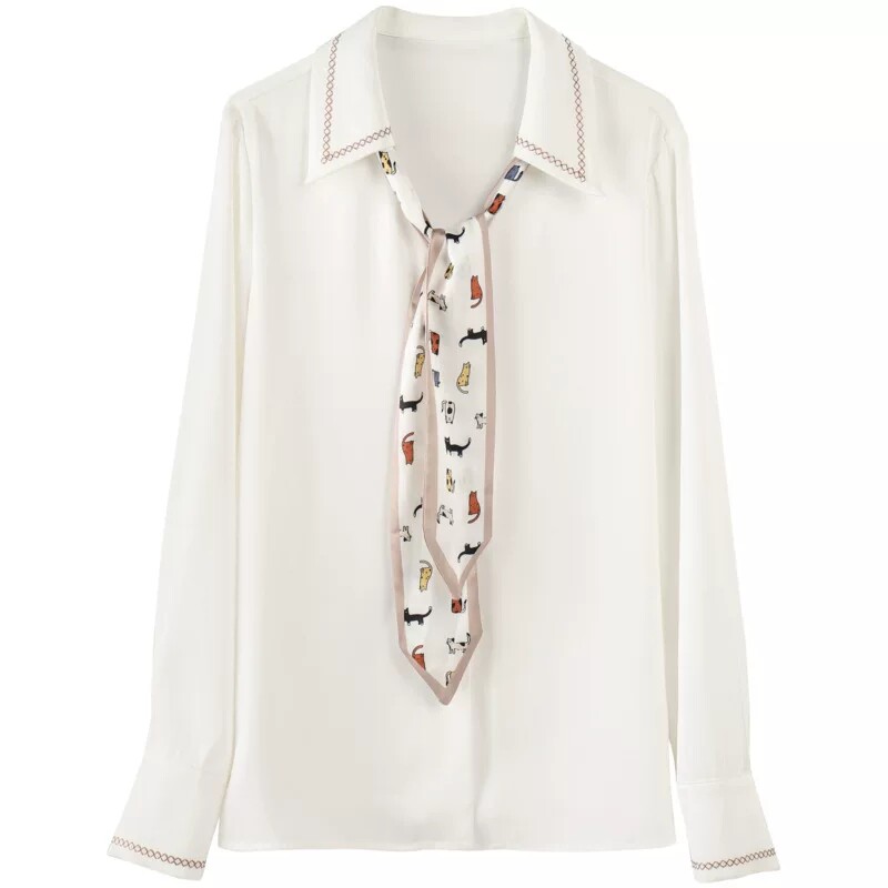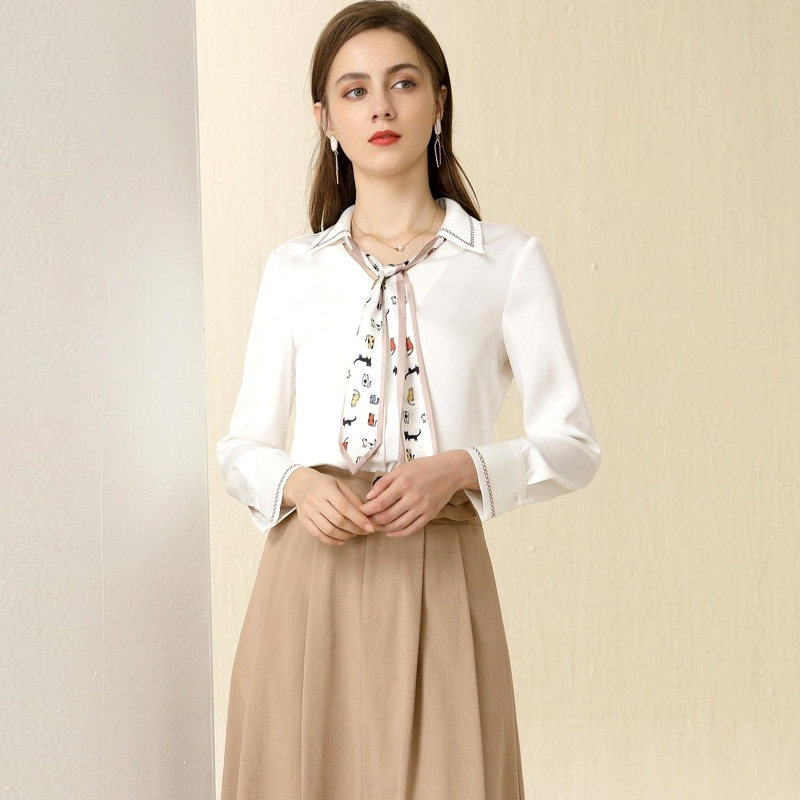襟元を華やかに彩る柄入りスカーフのボウタイが魅力的なブラウスです。