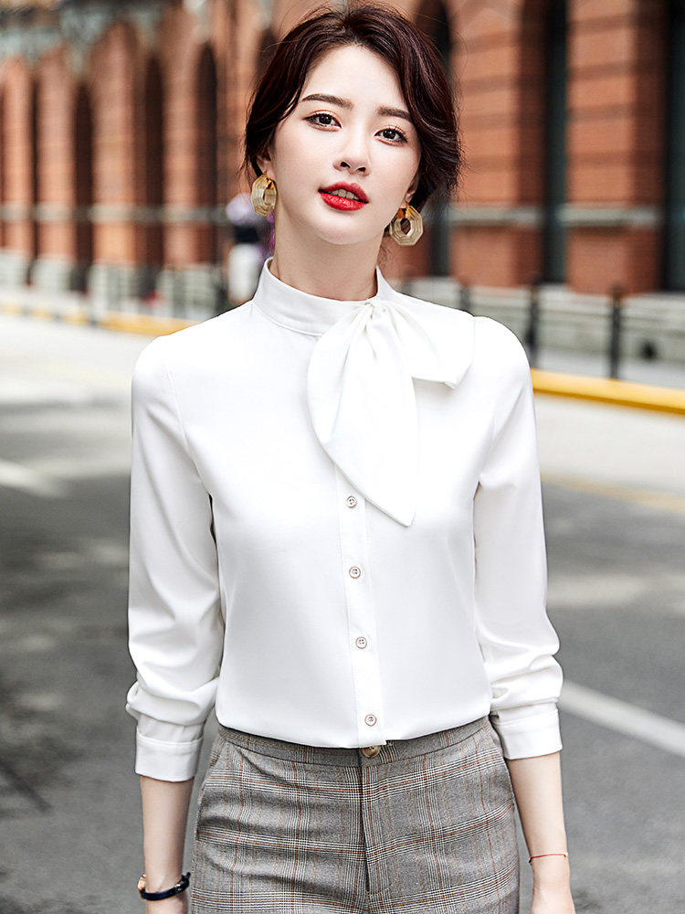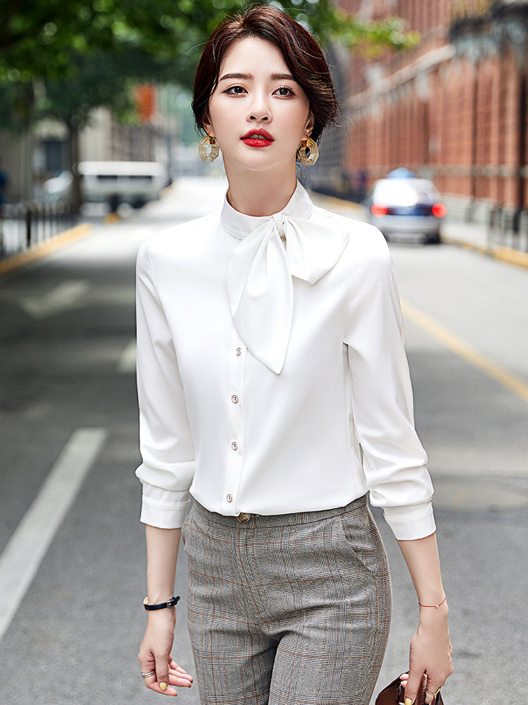 上品な印象を演出する長袖ブラウスです。