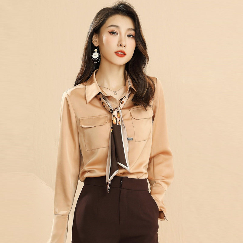 胸元の両ポケットと華やかなボウタイが特徴的なブラウスです。
