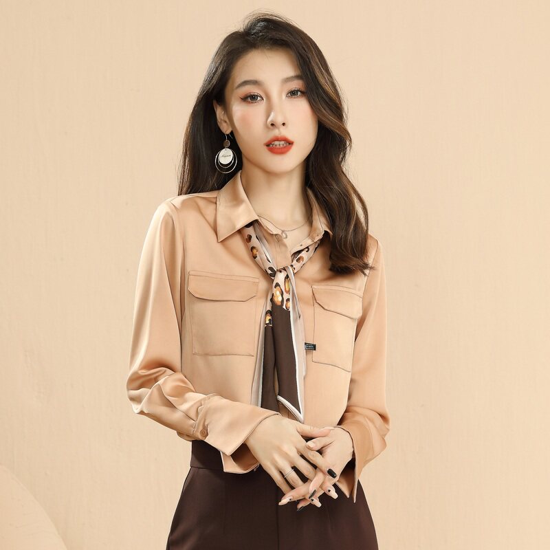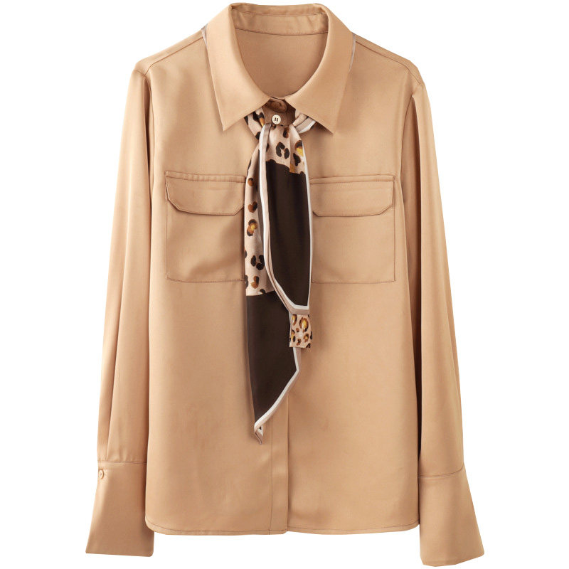 細長いスカーフ風のボウタイは豹柄とバイカラーデザインで首元にアクセントを添え、着こなしに洗練された印象を与えます。