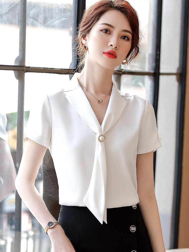 上品な光沢感のある素材を使用したボウタイブラウスです。 首元のビジュー飾りがエレガントなアクセントになり、通勤からフォーマルシーンまで幅広く活躍します。 襟元の開き具合が綺麗なVラインを演出し、女性らしい華やかさを引き立てます。 半袖仕様で季節の変わり目にも快適に着用でき、スカートやパンツスタイルとも相性抜群の万能アイテムです。