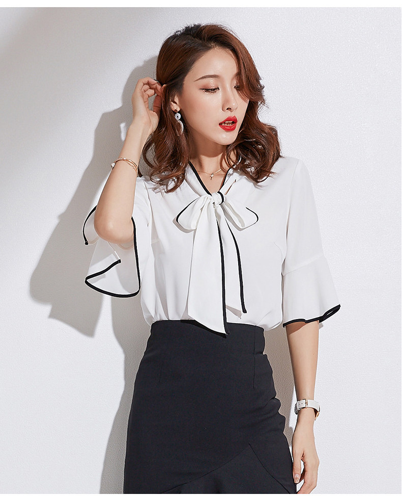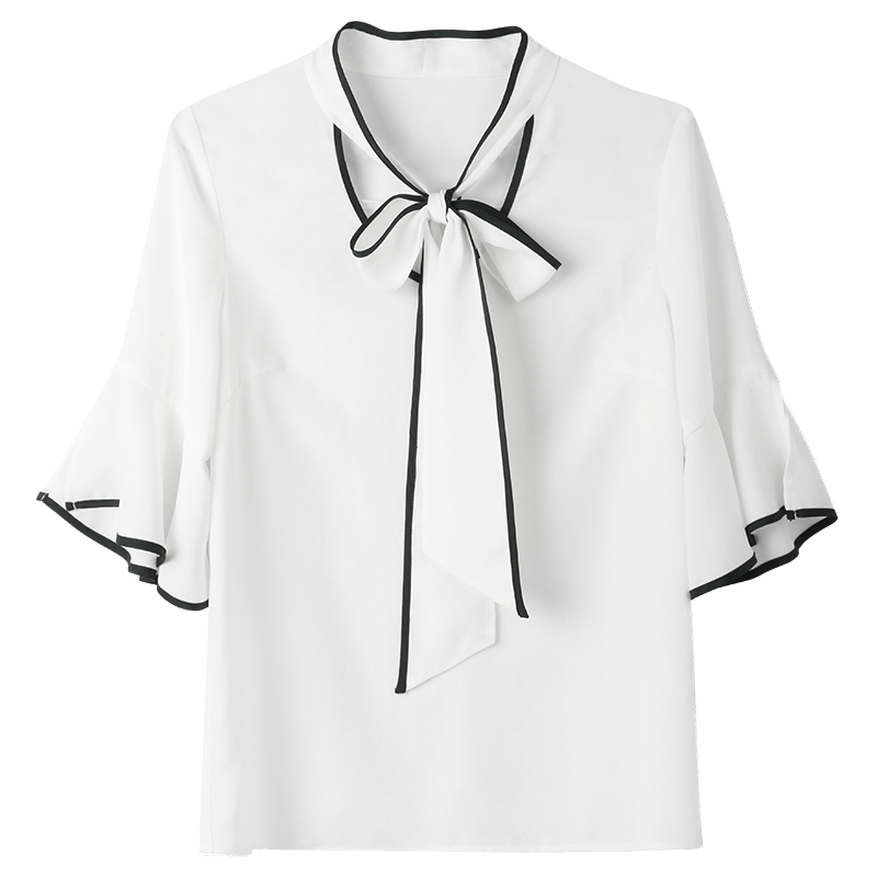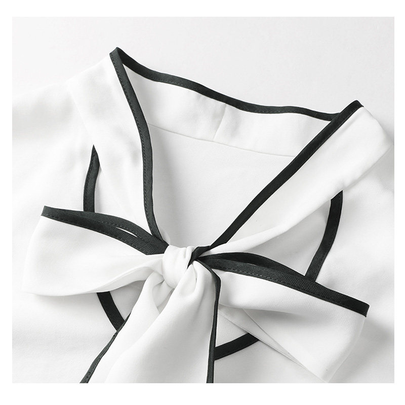 首元の大きなボウタイが上品な印象を与えるブラウスです。 袖口と襟元に施されたパイピングが洗練されたアクセントになっています。 フレア袖のデザインが女性らしさを引き立て、通勤からお出かけまで幅広く活躍します。 ボウタイは取り外し可能で、シーンに合わせてアレンジが楽しめる一枚です。 きちんと感がありながらも柔らかな雰囲気で、オフィスコーディネートにも最適です。