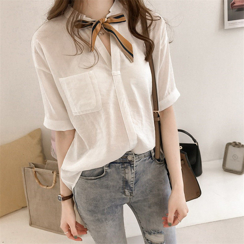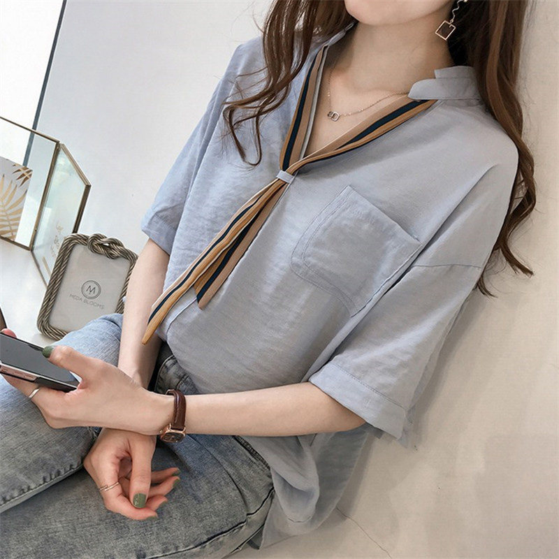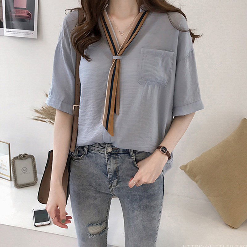 襟元の配色ストライプのボウタイが上品なアクセントになった半袖ブラウスです。